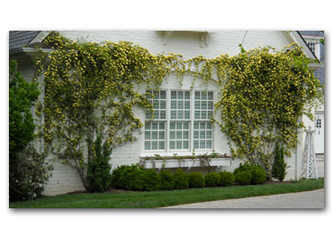 What else do you need in the early spring? The yellow Lady Banks rose has a very loose evergreen growth habit which has been supported with thin guide wires. Right after it blooms we will prune it hard, and again in the summer so it does not get gangly. Like many climbing plants. You want it to go up narrow and then go wide at the top.