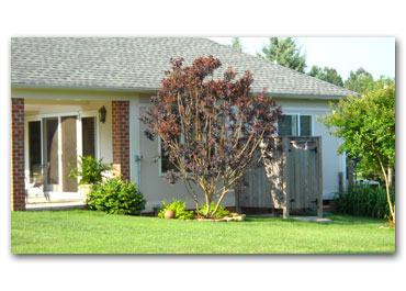 This red leafed smoke bush can stay close to this pool house. Its height and breadth can be controlled with proper pruning. In the spring red leaves and the plume of smoke bloom are striking. In the fall the leaf color is a golden yellow.