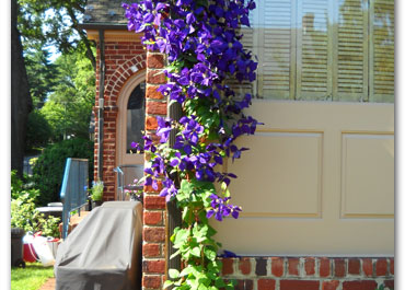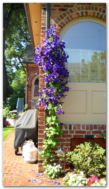 This three year old clematis was cut to the ground in early March. Here it is in late May with the help of an almost invisible guide wire.
