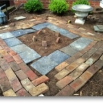 Our second garden has a lovely view of St John’s church from the front porch. Again, there was nothing but dirt and mulch. In the front, we dug below a foot of mulch to find old brick. We used that brick and the client’s slate. The guys and I played with how much inventory we had to make a geometric shape under a millstone we had lying around.