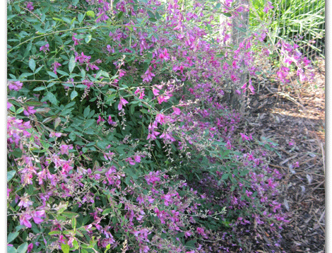 Lespedeza is one of my favorite plants partly because of its old fashion name “kissing by the garden gate”. You get a lot of bang for your buck with this $12.00 perennial that starts out the size of your hand and grows bigger than you in 3 years. The pretty pink flowers are shaped like a pea bloom and lasts for months. The only maintenance is to cut the plant with hedge clippers in June, and then again in February.