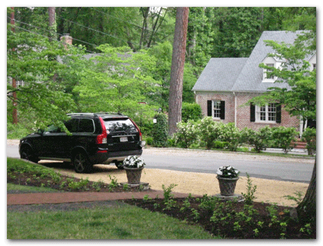 How about a driveway pull- in with warm tan stone that doesn’t splay? Try Sherando buff. Unlike pea gravel, it is a clean stone (no dust) and angular.