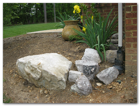 There was heavy erosion to this slope whenever it rained. The gutter just could not handle it all. Instead of a pricey retaining wall, we installed a few heavy boulders, so when the rain did fall, it hit the rocks.