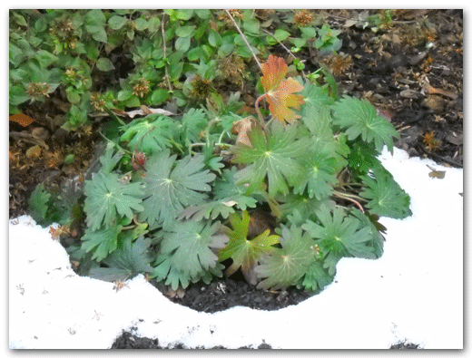 Geranium Cranesbill– This blooms with small pink, purple or blue flowers from late spring to late autumn. The foliage still holds its burnt red color that it had in the fall.