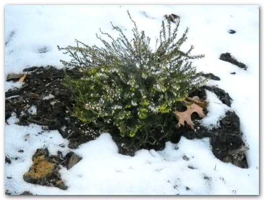 Heather– This is an evergreen bloomer and comes with white, pink or purple flowers. I use these in the more prominent beds in the winter, then move them to a less visible area in the summer since their foliage alone can look a bit coarse.
