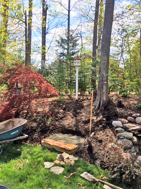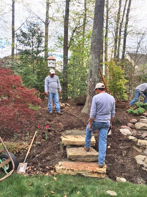 Plant ferns, tiarella, Lenten rose or ajuga around the steps for the woodland effect. It is heavy work, so get a few people on the project and take it slow.
