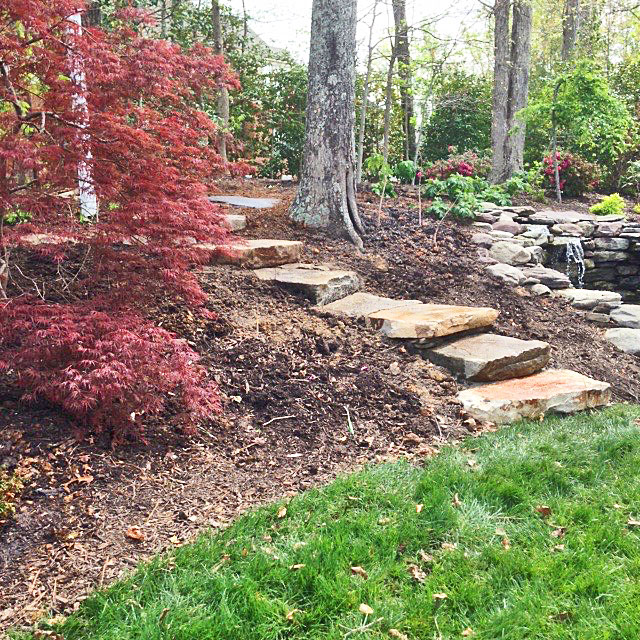 The trick here is to get a stone with a thick riser so it can serve as a step up. Use a straight shovel to dig into the hillside for the stone you are ‘planting’ and dig a flat area parallel to the stone you just placed for the next step. Use 2’ of stone dust under each ‘step’ to make a sturdy base so the stone doesn’t rock.