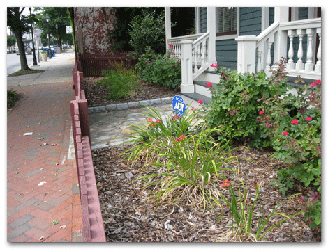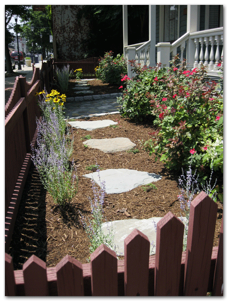 We were asked to continue with the front yard of last month’s Church Hill garden by planting flowers within a picket fence. The design gave the space a lovely English garden look with flowers in the front. Their existing knock out roses stayed, but we added Russian sage, a “Sonora” rudebekia, and two “Pinky Winky” hydrangeas to give the garden color lasting into the late fall. Powerful tumbled blue stepping stones add weight and power to the small space.