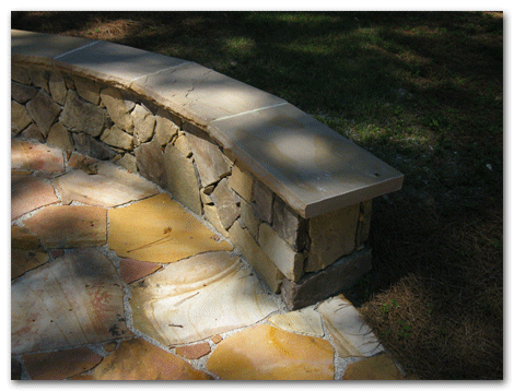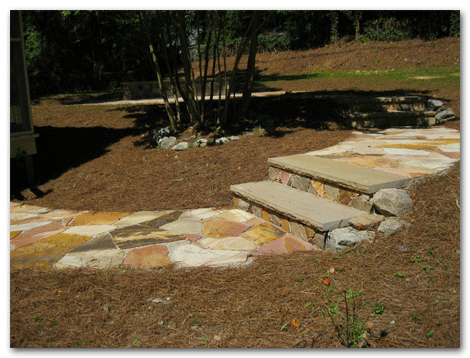 This client chose 3 types of stone to blend into her new dry lay terrace, seat wall and sweeping stairway. The air of mystery is added by the existence of the multi trunked crape myrtle. Little did we know before we began clearing the lot that the neglected tree would become such a key element in the design?