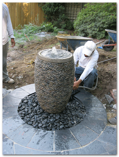 This Westover Hills terrace was designed by Christie and the client with a diamond shaped pattern in black slate. The fountain is set off by the circular slate base. It is its own entity- half on and off the terrace, half in and out of the lawn. We will show more pictures next month of the entire job.