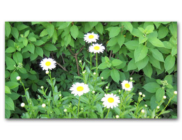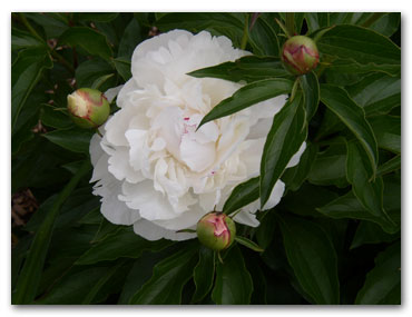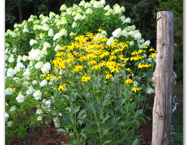 We use white as a dramatic foil for other colors.  A yellow is much more intense (see picture) when backed up with white.  Even if you don’t have a totally white garden, you can plant pure white next to a bright purple, for instance, to make the second even more striking.  Take a look at these whites.
