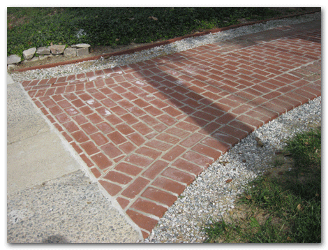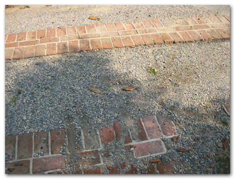 This old brick driveway skirt had broken and sunken bricks lay at odd angles.  It had collapsed in some places over the years from heavy use. Both clients (because they share this driveway) wanted it pretty and useful without losing any of the old charm of the original drive.