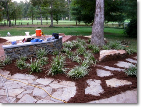 - Cutting the driveway corner to mimic the angled seat wall in the lower terrace, and splitting their inventory of liriope so it covers the area, which will surely be trampled over in raucous games of basketball.