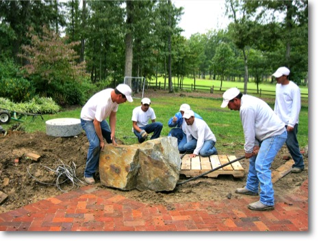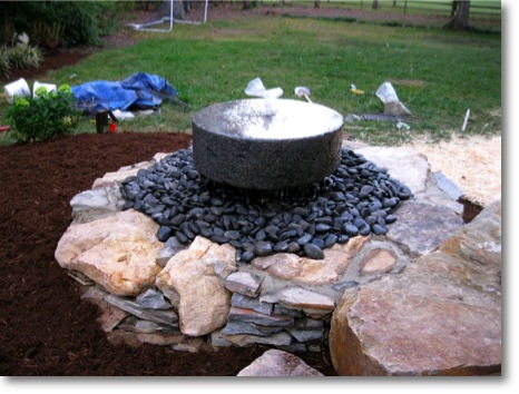 - Moving the huge boulder by hand around the patio and building the base of the fountain to fit into it. We created this focal point out of thin air.